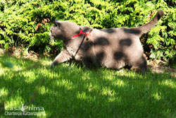 Die Chartreux Katze läßt es zu an der Leine zu laufen. So trägt Sie auch den Beinamen "Hundskatze" (franz.: "chat de chien").